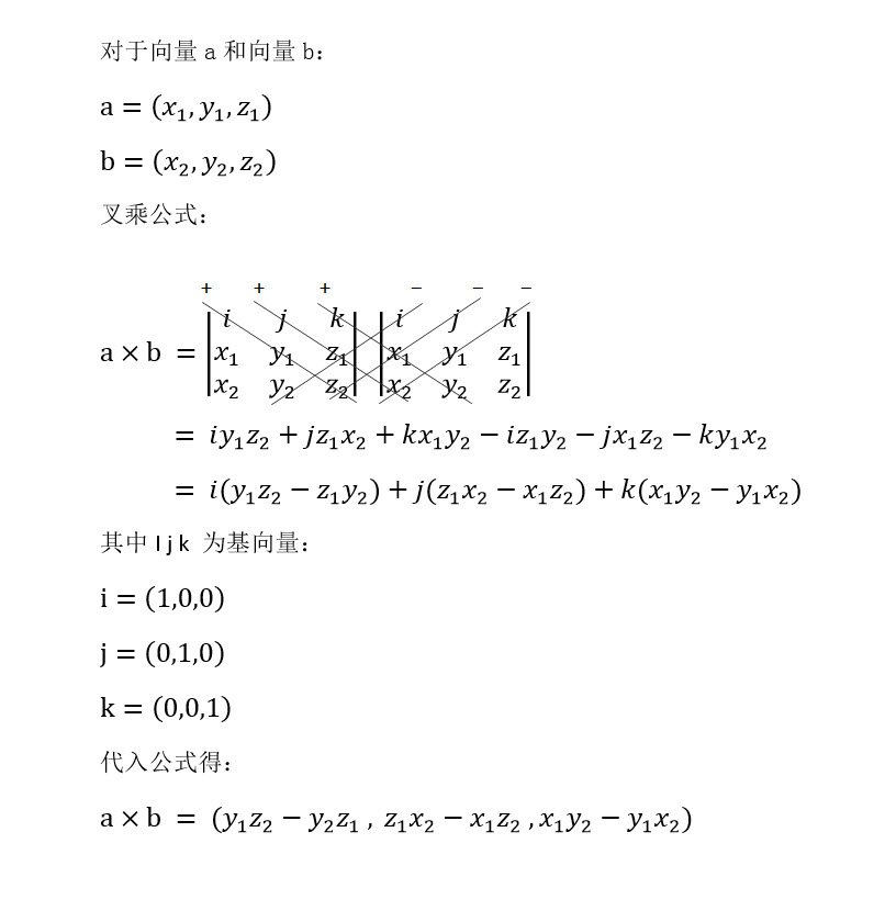 v1和v2向量的叉乘运算:相应元素的乘积的和:v1( x1, y1,z1) x v2(x2, y2, z2) = {(y1z2 - y2z1),(x2z1 - x1z2),(x1y2-x2y1)};